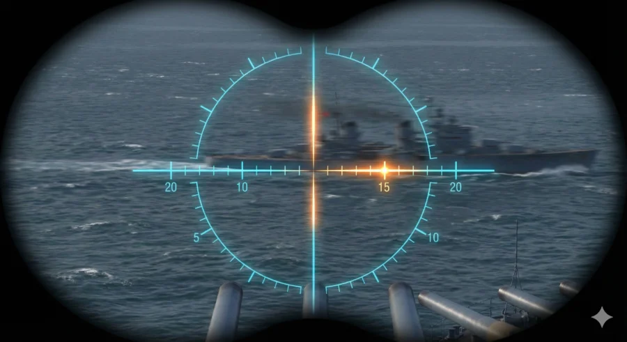 双眼鏡を覗いた時の照準器。これも好みはありますが、初心者の提督には「ダイナミック」タイプをおすすめします。 ズーム倍率を変えても、メモリの目盛りが着弾時間に合わせて自動調整されるため、「偏差射撃(敵の未来位置を予測して撃つこと)」が非常にやりやすくなります。