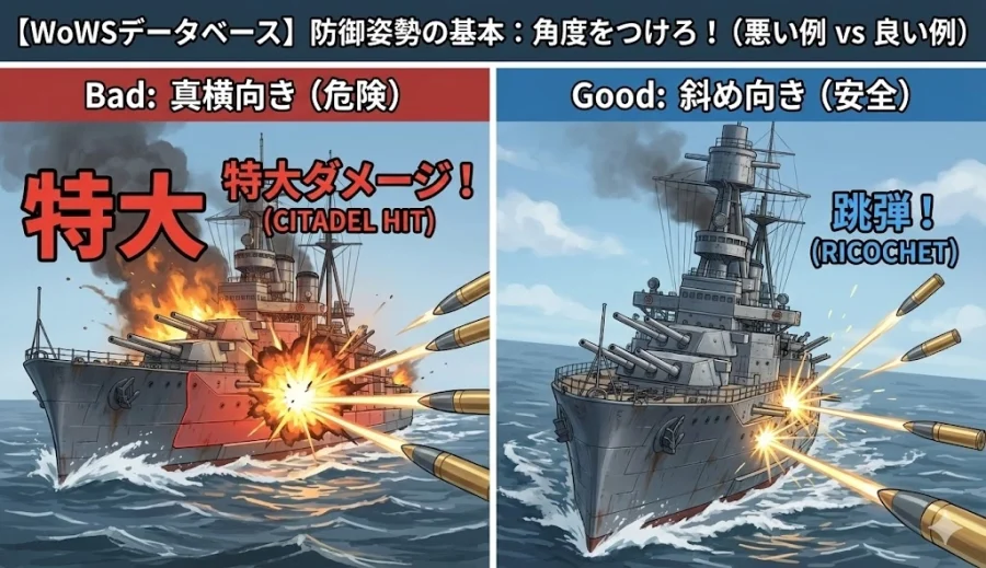 WoWSには「跳弾(Ricochet)」というシステムがあります。 AP弾は、鋭い角度で装甲に当たると、貫通できずに「カキン!」と滑って弾かれます。これを利用するのです。