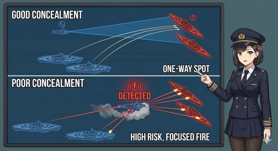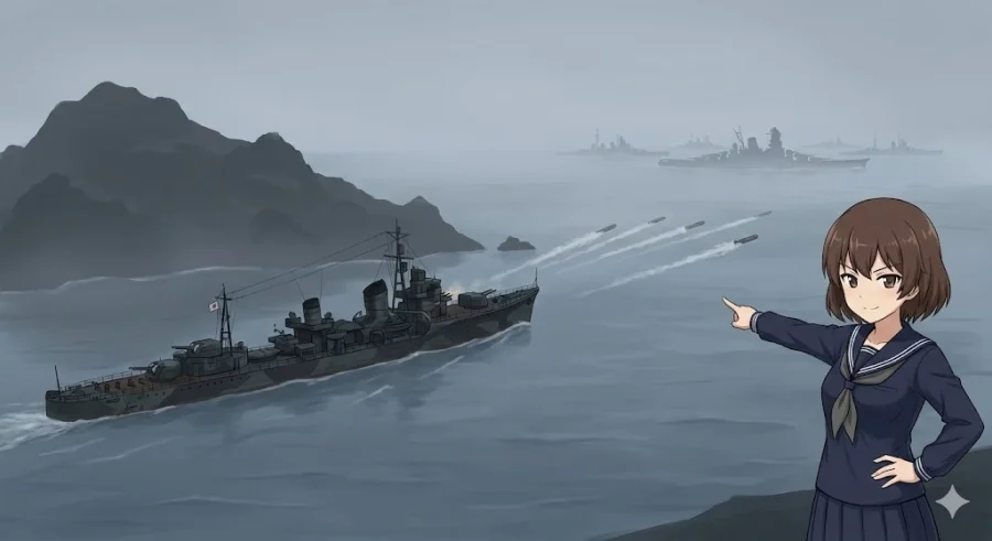 - 一歩引いた位置取り: 隠蔽の良い敵駆逐艦に対して、自分から先に踏み込むと「一方的に見られている(自分だけ見つかっている)」状況になりがちです。 最前線より少し後ろ、あるいは島影を利用して接近しましょう。
