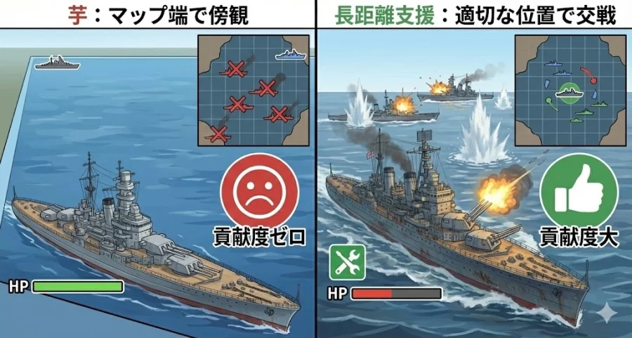 要するに、「リスクを恐れて逃げている」のが芋、「最大火力を出すために距離を調整している」のが長距離支援です。