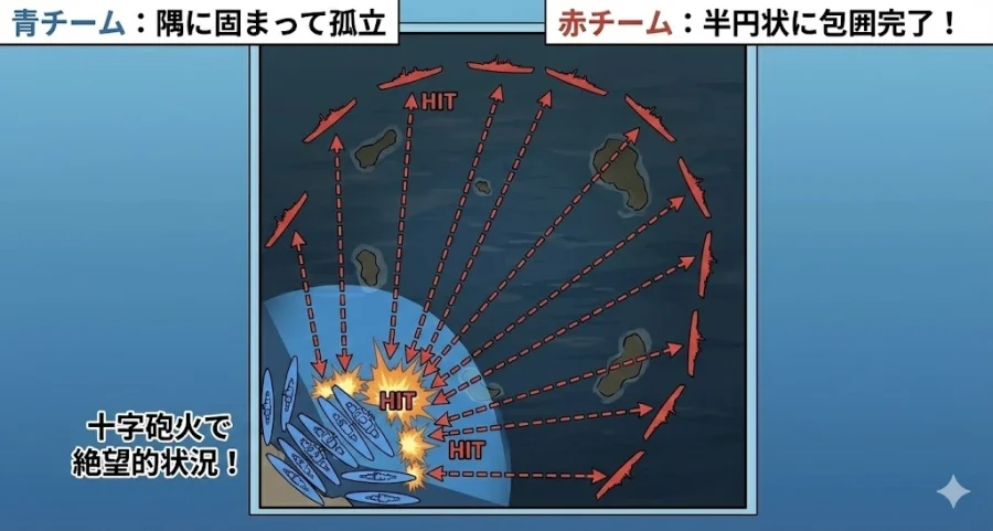 - 「包囲(クロスファイア)」される: これが致命的です。自分たちがマップの端に押し込まれると、敵は正面と側面から十字砲火(クロスファイア)を浴びせてきます。こうなると防御姿勢も取れず、殲滅されるのを待つのみです。