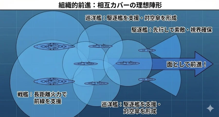 - 駆逐艦が視界を取り、その後ろ5〜10kmに巡洋艦、さらに少し後ろに戦艦がいるような「層」を保ったまま、全体でジリジリと上がる動きです。