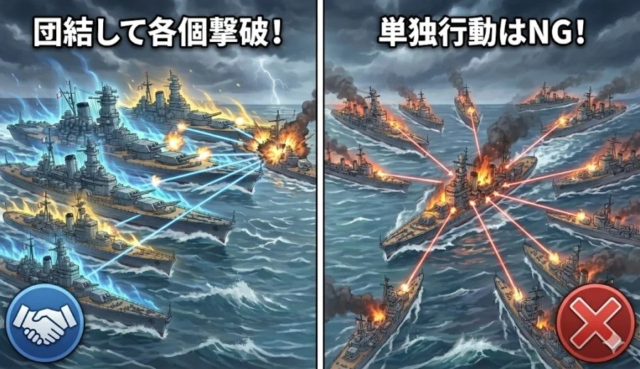 敵の戦艦は放っておいても勝てますが、敵の駆逐艦に肉薄魚雷(至近距離魚雷)を撃たれると事故死します。 見えた駆逐艦は、チーム全員でフォーカスして最優先で沈めましょう。