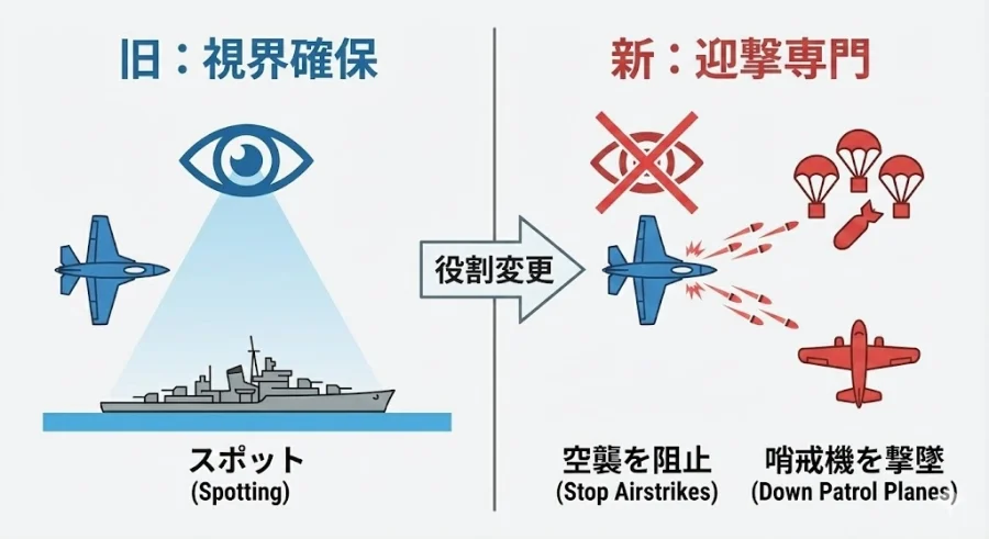 最も戦術的影響が大きいのが、この「戦闘機の役割変更」です。 これまで艦載機や消耗品として展開していた戦闘機ですが、その役割が「偵察」から「空襲へのカウンター」へと完全にシフトします。