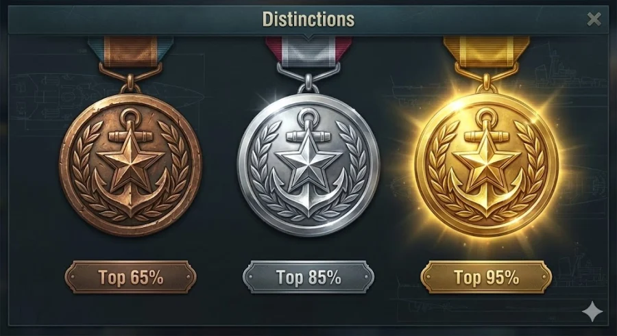 提督の卓越した戦果を可視化する新しいシステム、「殊勲賞(Distinctions)」が導入されます。 これは単なる勝利や敗北ではなく、「同艦艇を使用する他のプレイヤーと比較して、どれだけ優れた成績(基本経験値)を残したか」を評価するものです。